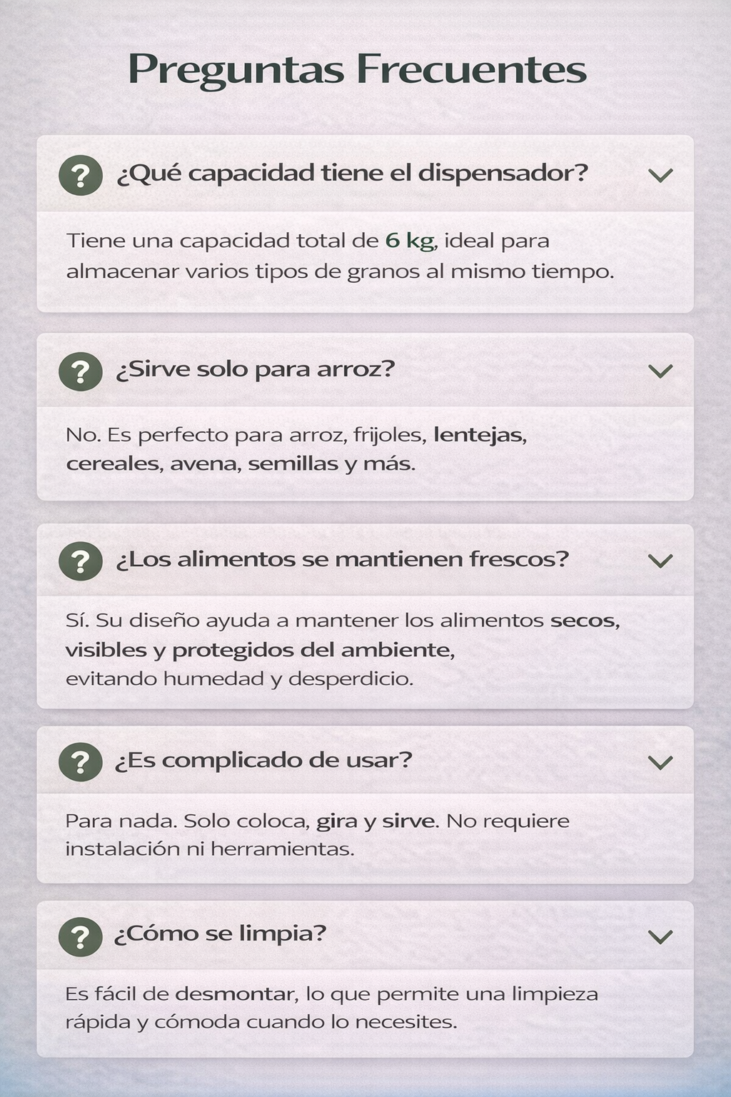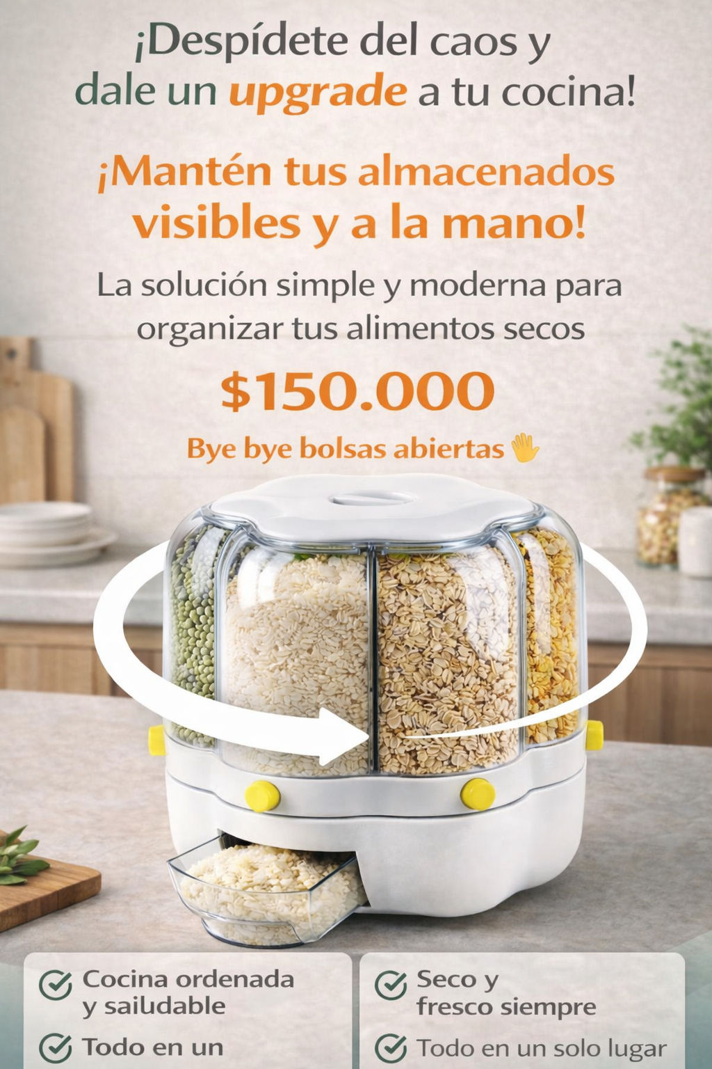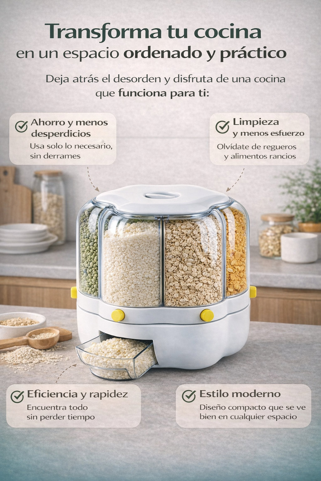 Beneficios: Mantén tu cocina organizada y limpia. Evita desperdicios gracias a su sistema de dosificación. Almacena alimentos de manera higiénica y segura.
